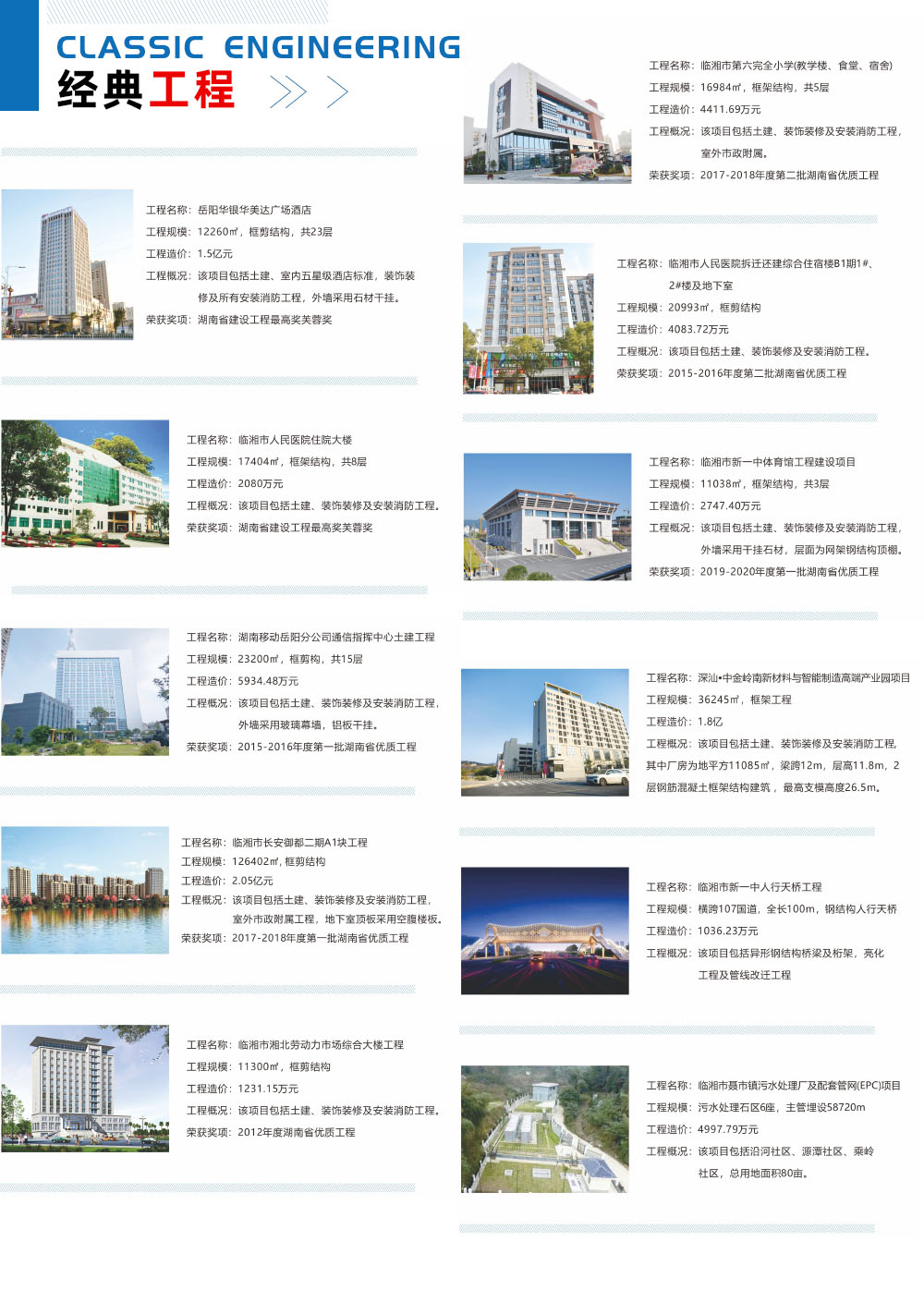 岳阳亿利达建设工程有限公司创立于1997年8月,注册资本10000万元,具有房建施工总承包一级资质,是临湘市建筑行业国家一级企业,年产值3亿多元,公司秉承“创新、效率、诚信、共赢”发展理念,业务立足湖南,辐射苏粤,承建工程严格按照质量标准化及优质工程标准组织施工,工程质量合格率100%,优质率达60%,近五年获省芙蓉奖2项,省优质工程6项,连年被省市主管部门评为工程质量安全管理先进单位、十佳建筑企业。